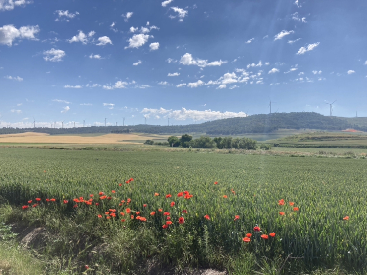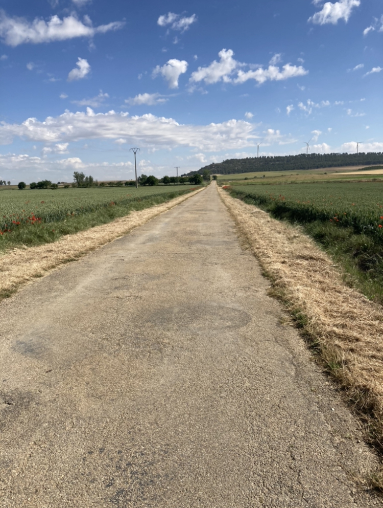 El trayecto, que David me había sugerido con la aplicación Mapy, transcurrió apaciblemente entre caminos secundarios y el camino de Santiago. Apenas me crucé con nadie, un par de peregrinos nomás, y pude ir hablando sola o con la bici Anacleta y pararme varias veces a saborear el paisaje.