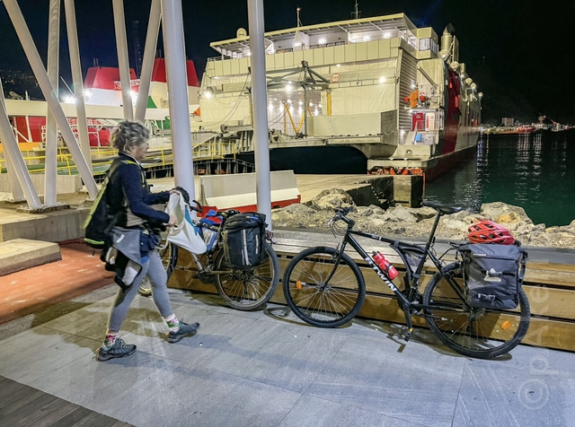 Llegamos al ferry sin problemas. Nos hicieron esperar a que subiesen todos los demás vehículos y un miembro del personal nos acompañó a pie, rampa arriba. Amarramos las bicis, como nos indicaron, a unos contenedores llenos de agua y luego nos acomodamos tranquilamente en las butacas de pasajeros.