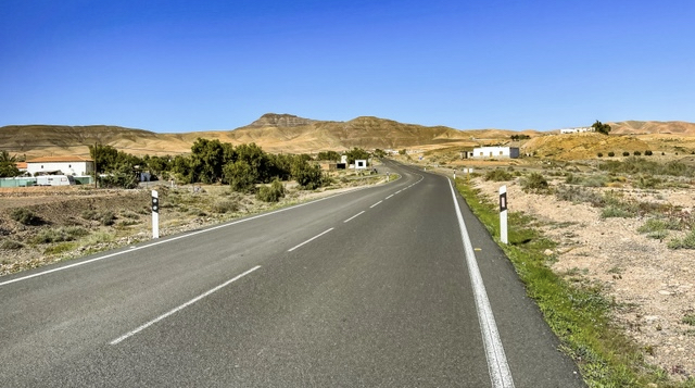 El comienzo fue muy duro, por la carretera. Había mucha cuesta y el asfalto ardía. Si soplaba el viento, se agradecía aunque hubiese que luchar contra él, porque al menos refrescaba. Pasamos por la zona más turística de Morro Jable, sin detenernos. Por allí, al menos había carriles bici. Luego, llegamos a una verdadera autopista ciclista, un carril bici amarillo que transcurría junto a la carretera principal. Pese al sol abrasador, fue maravilloso rodar por allí: el firme parecía recién asfaltado y no había obstáculos de ningún tipo.